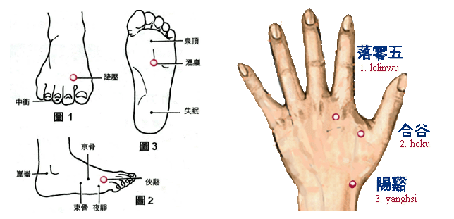 按 陽谿、合谷、落零五。 此外 腳穴可按 湧泉、降壓和俠谿