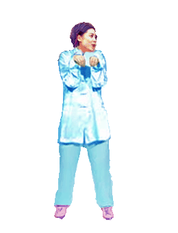 第一式:猿提 1、兩掌放在體前,手指分開按掌,再旋腕屈指合攏捏成“猿鉤”。 2、兩掌上提至胸,兩肩上聳,收腹提肛;腳跟提起,頭向左轉;目視左側。 3、頭轉正,兩肩下沉,腳跟著地,鬆腹鬆肛;“猿鉤”變掌,掌心向下;目視前方。 4、兩掌沿體前自然垂下於體側;目平視﹐調息。 動作5 - 8:同動作1 - 4,惟頭向右轉﹐目視右側。 重複1 - 8一遍。 要領: 1、轉變猿鉤要快速,意在增強神經肌肉反應的靈敏性。 2、縮項聳肩,伸頸沉肩,鬆腹和擴大胸腔體積,可增強呼吸,按摩心臟,改善 腦部供血。 3、提踵直立可增強腿力,提高平衡功能。提踵落踵有助心腎相交。 4、收腹提肛有助鍛煉五臟六腑﹐可防治老人遺尿之煩擾。 練功口令: - 猿鉤上提,縮收左望。 轉正鬆沉,下按腹前。 [ 左右各做兩 次] 第二式:猿摘 1、重心右移屈膝,左腳後撤步點地;屈左臂,左掌變猿鉤藏左腰側;右掌 放前掌心向下。 2、左腳踏實屈膝下蹲,收右腳至左腳內側成丁步;右掌經腹前划弧向左上方至 頭左側,掌心對太陽穴;目隨掌動,再轉頭注視右前上方。 3、右掌內旋,掌心向下,沿體側下按至左髖側;右腳向前邁出一大步,重心前 移;右腿直立左腳伸直尖點地;左掌經體前向上伸舉,舉至右上角變猿鉤,成採摘 姿勢;眼望左手鉤。 4、重心後移;左鉤“握固”(屈拇指貼掌心﹐其餘四指握拳)變拳;右手掌自然 回落體前,虎口前向。隨後,屈左膝下蹲,右腳收回丁步;左臂屈肘收至左耳旁, 掌心向上成托桃狀;右拳變掌經體前向左划弧至左肘下捧托;目視左掌。 5 - 8 同動作 1 - 4,左右相反。 重複 1 - 8 一遍後,左腳向左橫開一步,兩腿直立;兩掌掌心向上向身前方舉 起,與胸同高;屈肘收掌內合下按,目平視﹐調息。 要領: 1、左顧右盼有利頸部運動,促進腦部的血液循環。 2、動作的多樣化使神經系統和肢體運動的協調性,模擬猿猴採摘桃果時的心情, 可減輕大腦神經緊張,對神經緊張等症有防治作用。 練功口令: - 退步擺掌,丁步瞭望﹔ 前攀摘果,丁步托桃 [ 左右各做兩 次] |