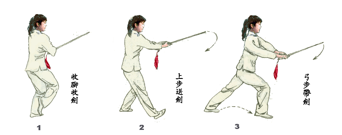 - Right foot steps up tip-toe next to the left foot; withdraw sword to closer to waist on the left,