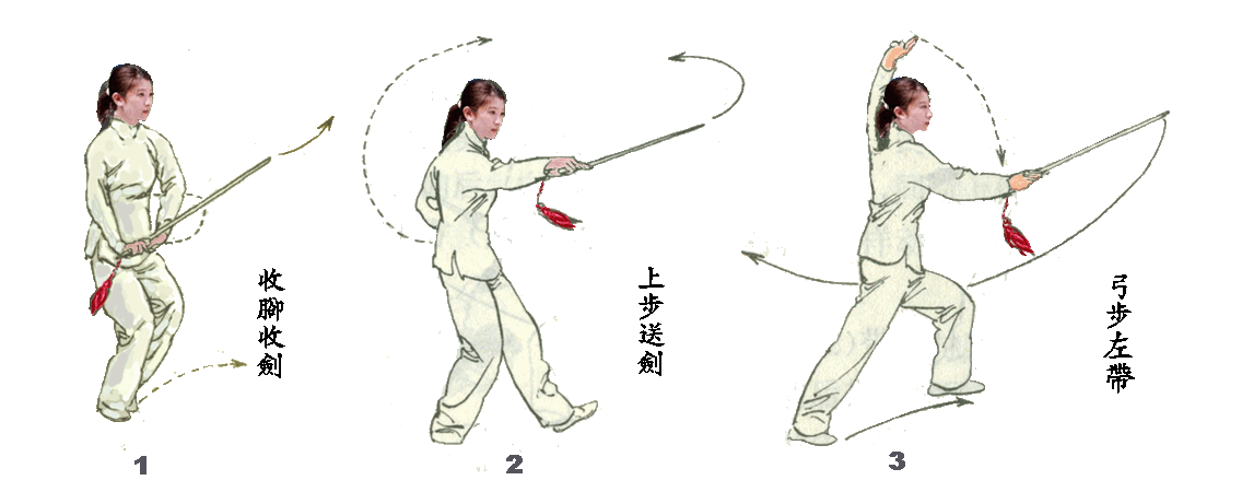 - Left foot steps closer to the right foot, tip-toeing, withdraw sword to near the waist on the right side
