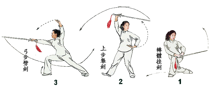 - Rise with the left leg, right foot step forward, raise sword curving above the head, elbow face the front