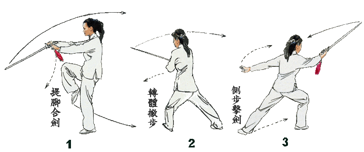 - Right foot rises up, rasie sword and sword finger briefly and rotate and exhange hand positions then corss the forearms