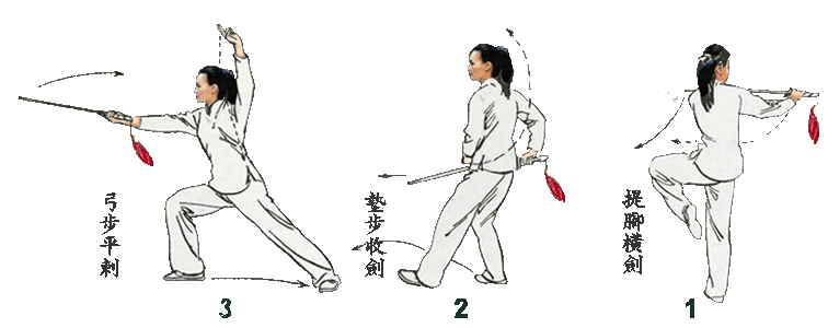 - Right foot steps up to a bow stance, pierce sword horizontally via the center, curve sword finger above head,