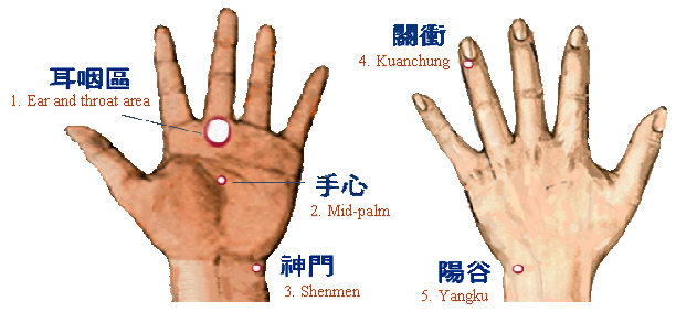 頭暈眼花主要是按關衝和陽谷。若是與耳疾有關﹐則加按耳咽區。舟車暈浪時可按 關衝、神門和手心。如有經常暈浪的習慣﹐可在乘搭舟車前按上述三穴作預防。 To relieve from dizziness the primary points to massage are (4) kuanchung and (5) yangku. If ear problem co-exists, also massage (1) the ear and throat area. To prevent from getting dizzy in riding, get a habbit of massaging often the 5 points/area. |